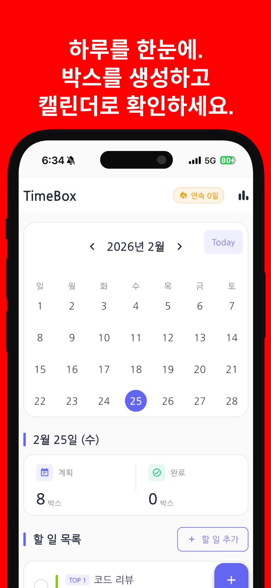 * 연속 일수(Streak): 매일 완료한 box 수를 기록하고 연속 달성에 도전하세요