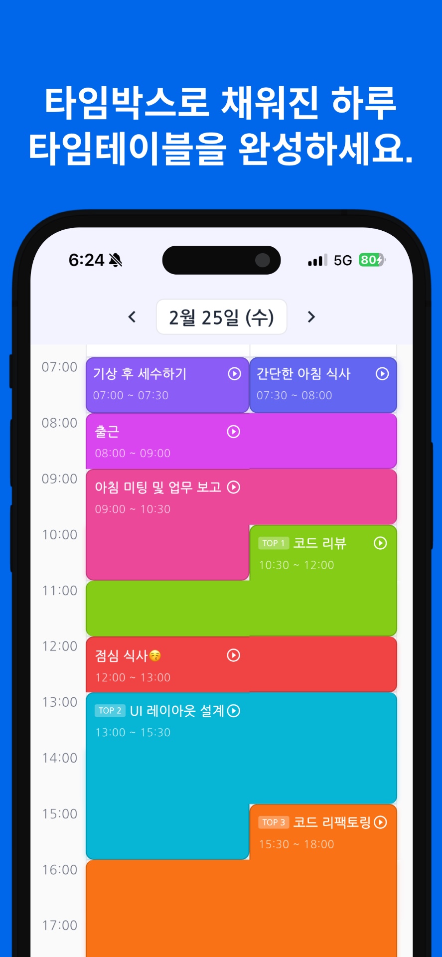 타임박스는 복잡한 설정 없이 바로 사용할 수 있습니다. 첫 할 일을 추가하고 시간 box로 배치한 뒤, 타이머를 시작하세요. 하루의 생산성 루프가 시작됩니다.