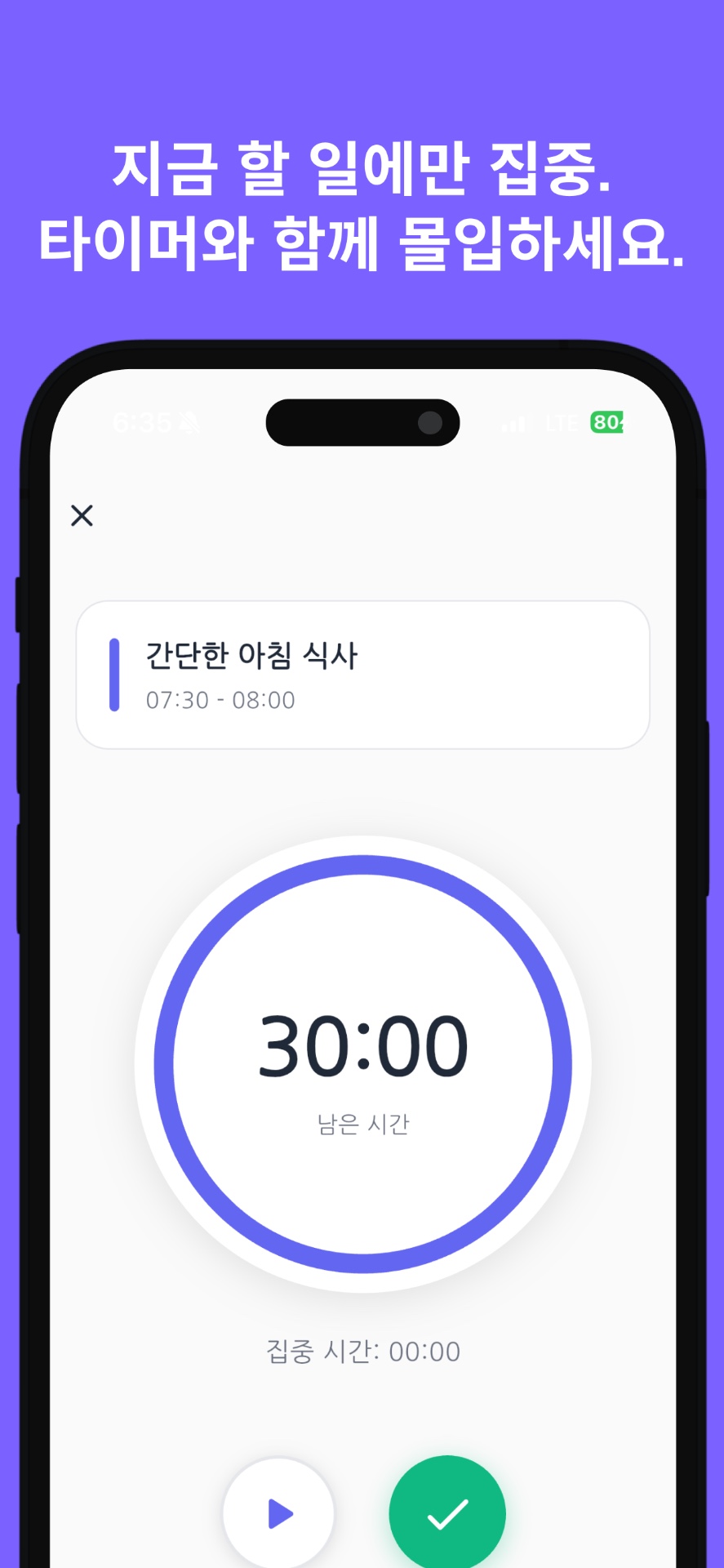 재생, 일시정지, 완료 버튼으로 간단하게 관리하세요