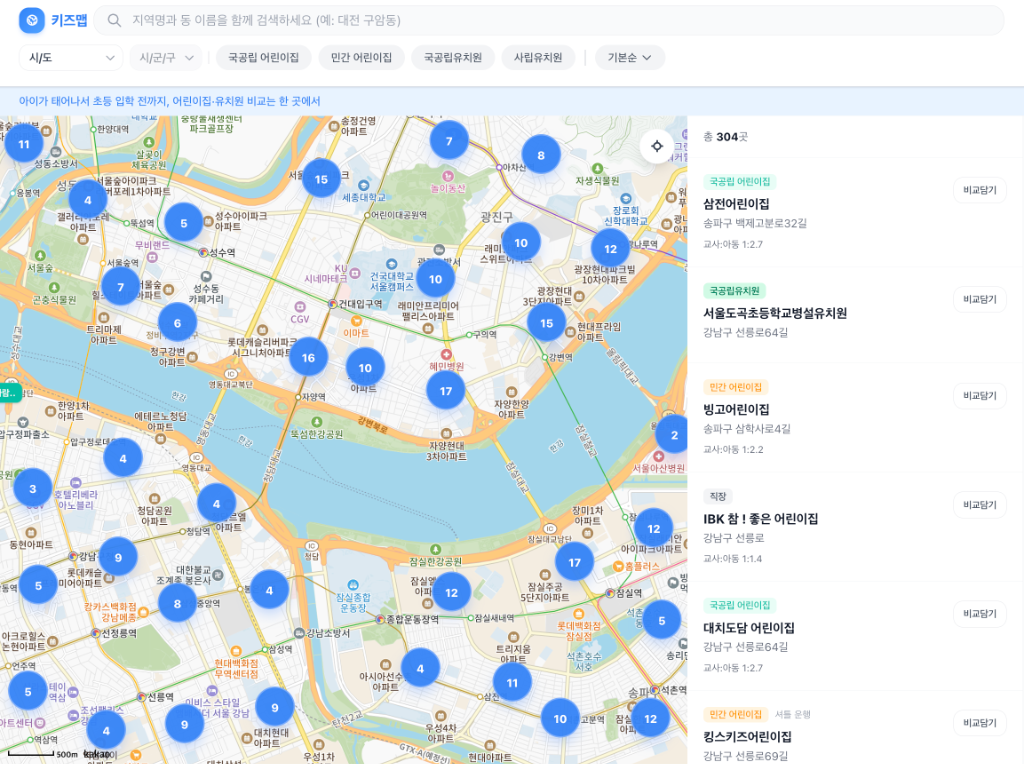 복잡한 검색 없이 지도에서 바로 위치를 확인하고 우리 아이에게 맞는 기관을 찾을 수 있도록 만들었습니다.