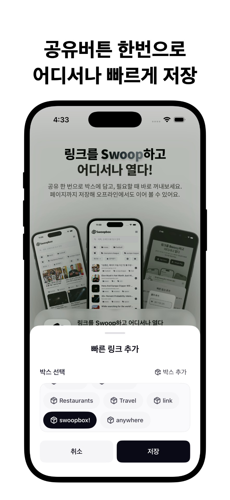 Swoopbox는 링크를 빠르게 저장하고, 다시 찾기 쉽게 만들어주는 앱입니다.
