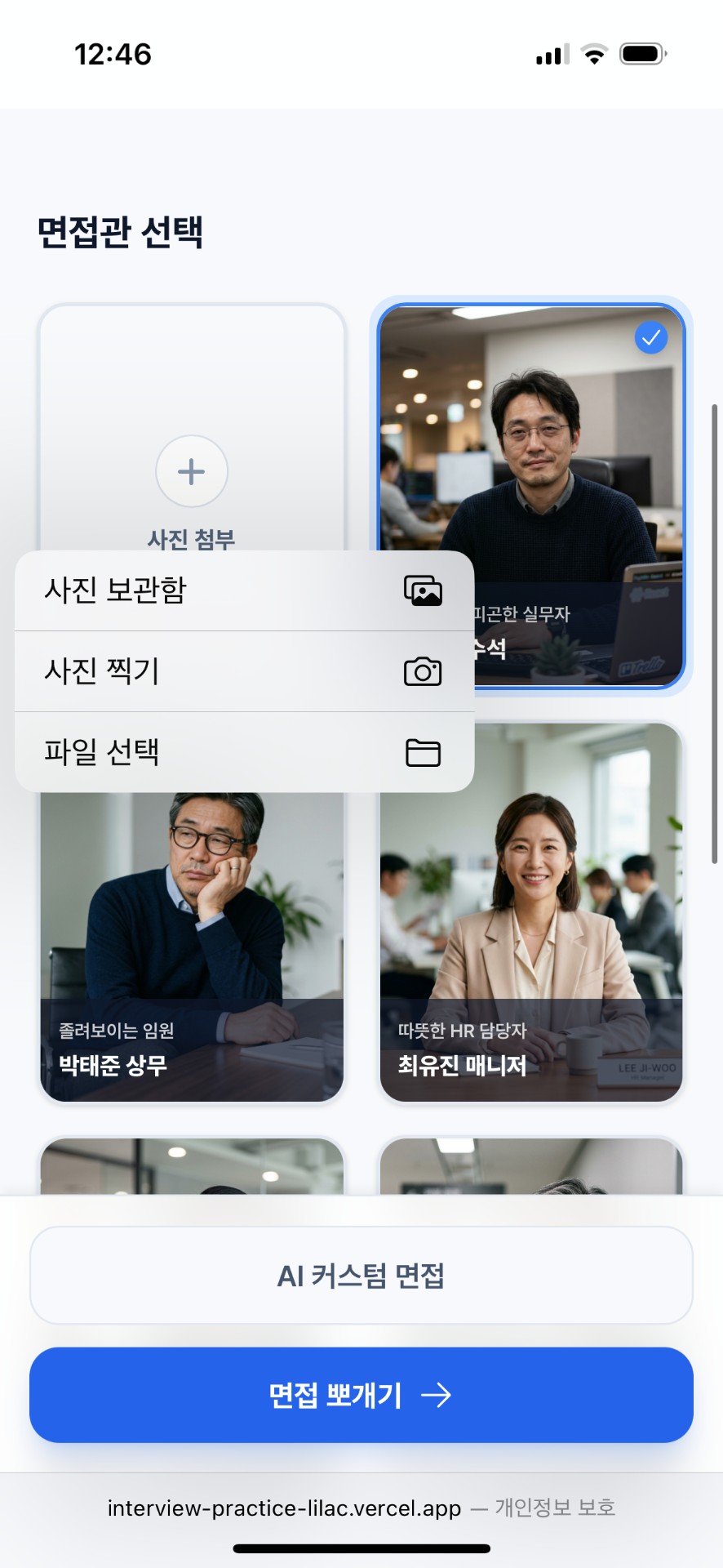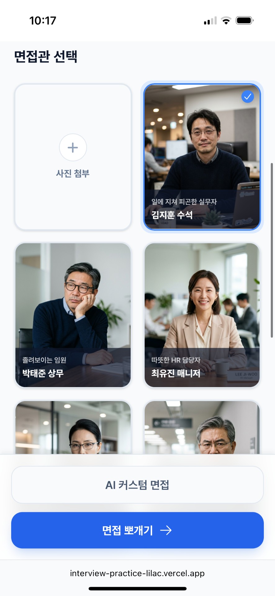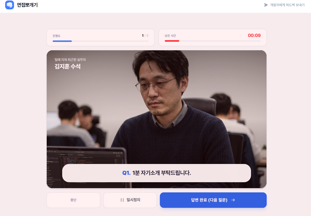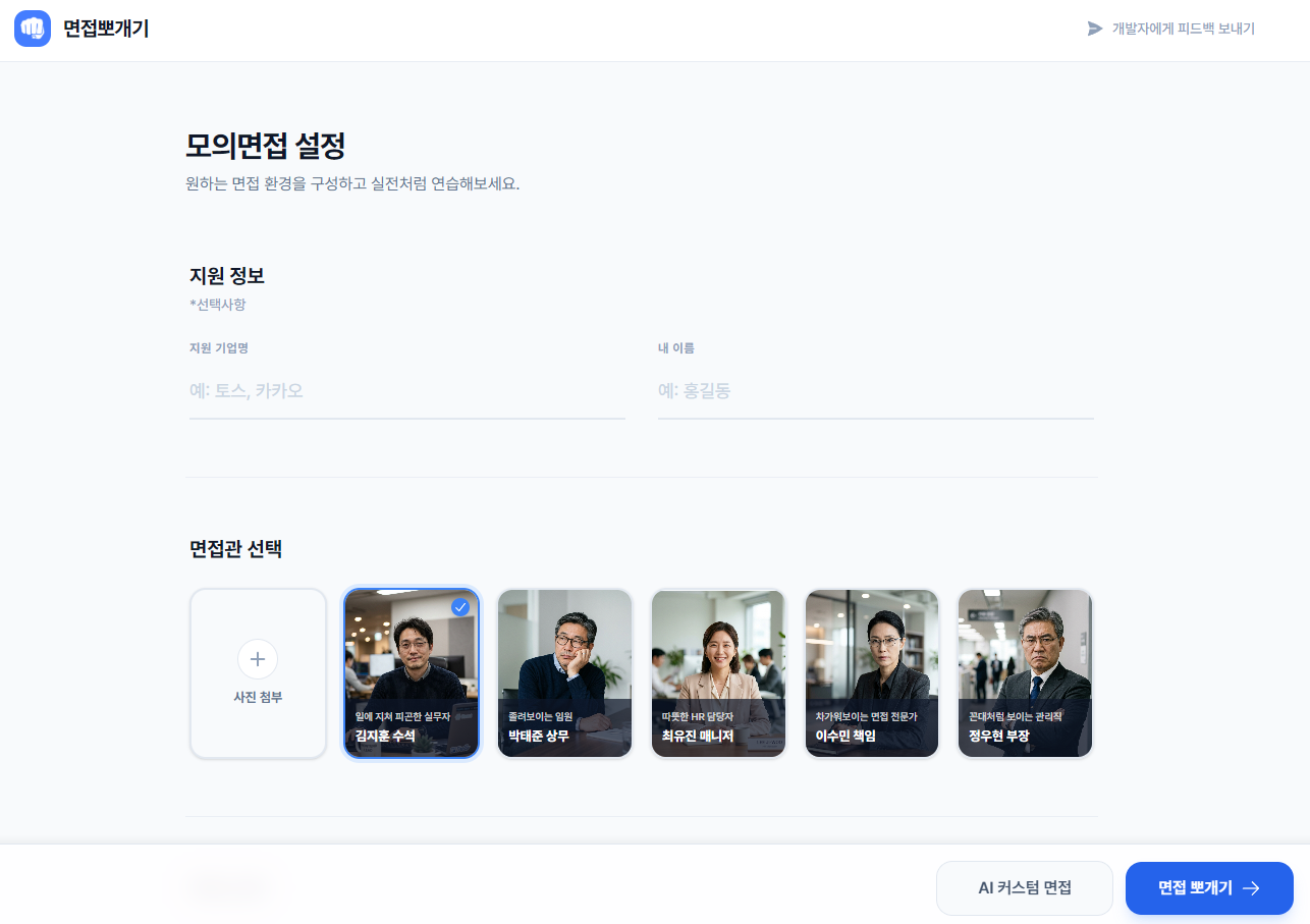 - 면접관 캐릭터 5명 중 골라서 모의면접 진행 or 직접 면접관 사진첨부